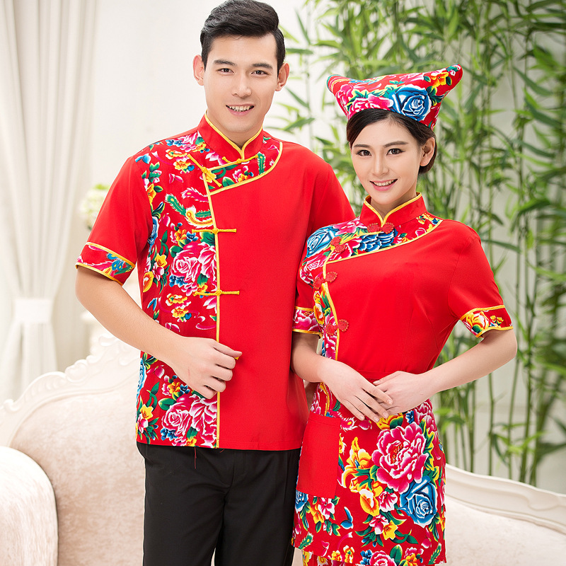 ホテルの従業員の作業服の夏服の女性のレストランの火鍋店の農家楽の東北の大きい花の布の半袖