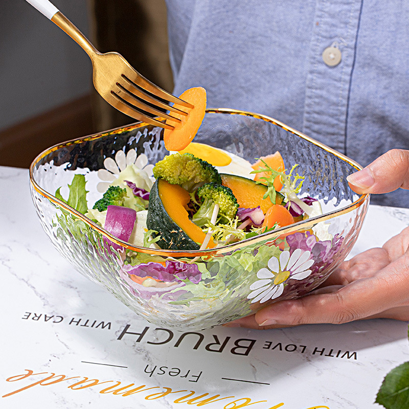 メーカー卸売りの四角形の金縁のハンマーの紋様のサラダの碗の大きいサイズの創意の小さい菊の透明なガラスのデザートの碗のセット