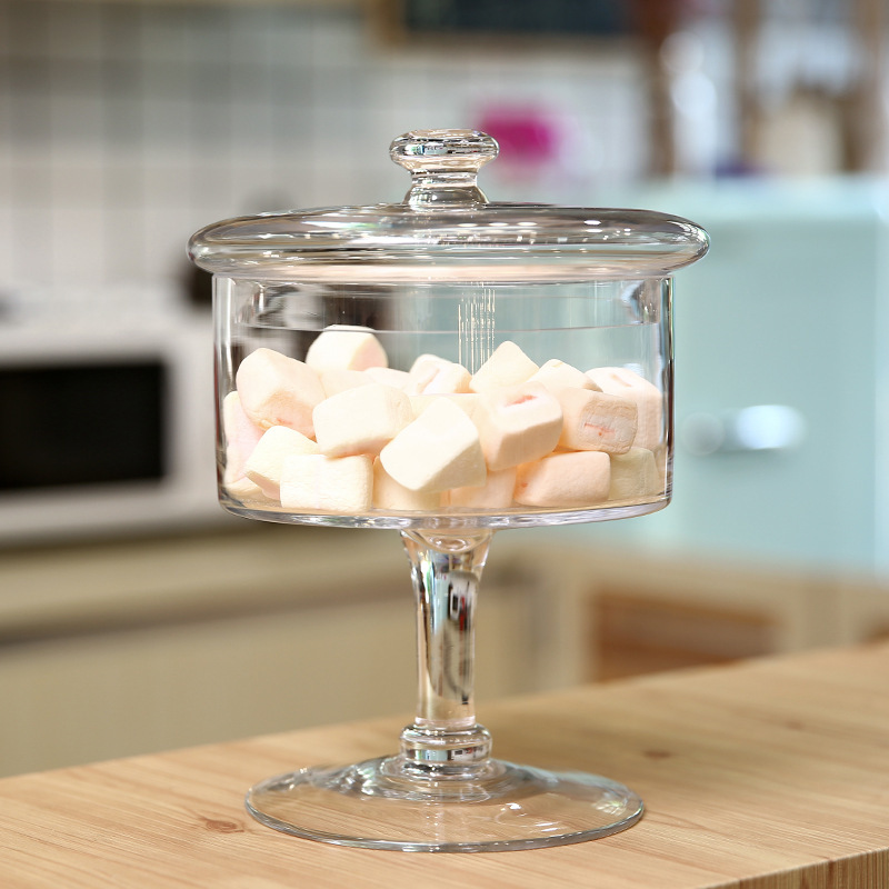 ヨーロッパのガラスキャンディージャー、背の高いトレイ、透明な保存瓶、ディスプレイデザートテーブル、結婚式の家の装飾、新しいスタイル
