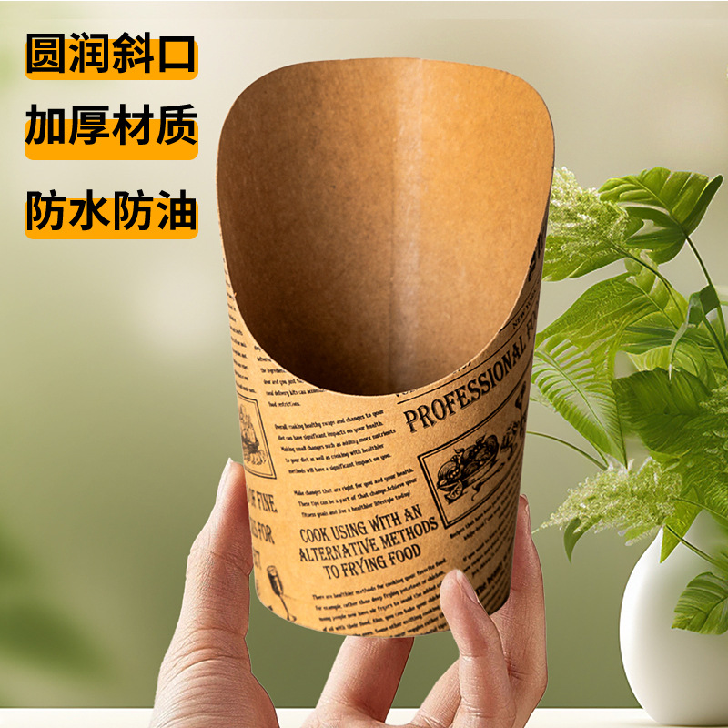 使い捨てフライドポテトカップ紙カップ食品グレードの厚みのある英語斜め口エッグワッフルポテトチップスカップカスタマイズ