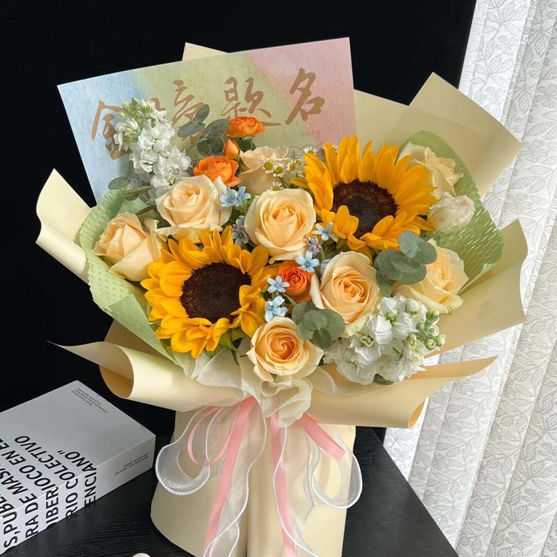 ゴールデンリストの名前入りひまわり模擬花束完成品、高校受験、大学受験、卒業記念品、クラスメート、友人、先生へのギフト