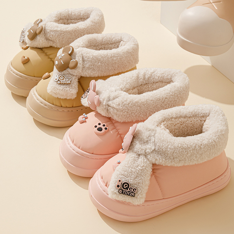 蝶結び綿のスリッパの女性の秋冬の2024新型の漫画の保温の厚い底の毛のぬいぐるみの保温の月子の靴の女性