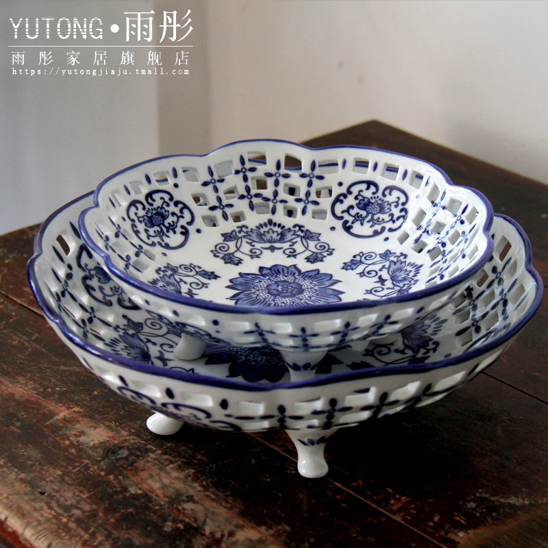 雨の黒い陶磁器は足の家の古典の中国式の青い花の磁器の四角の透かし彫りの果物の皿の陶磁器の果物の皿の装飾の置物を持ちます。