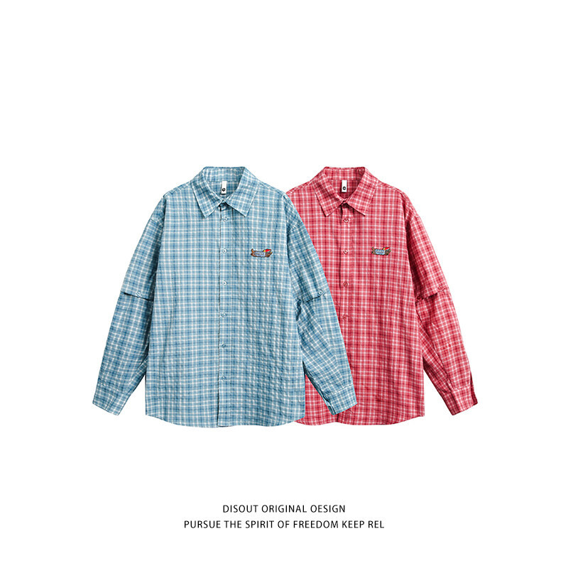 2025夏の男性の格子の長袖のシャツの潮流はつなぎ合わせて袖のシャツの長い半袖のシャツの青少年の上着を取り外します。