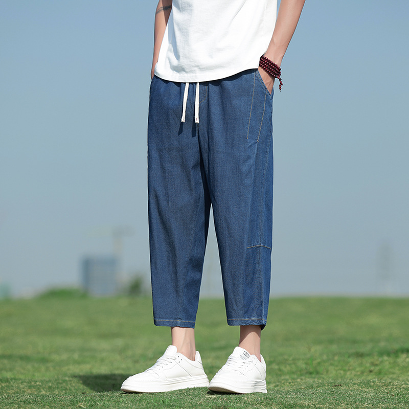 中国風ジーンズメンズ夏薄手大きいサイズルーズストレートパンツドレープカジュアル9点パンツジーンズ