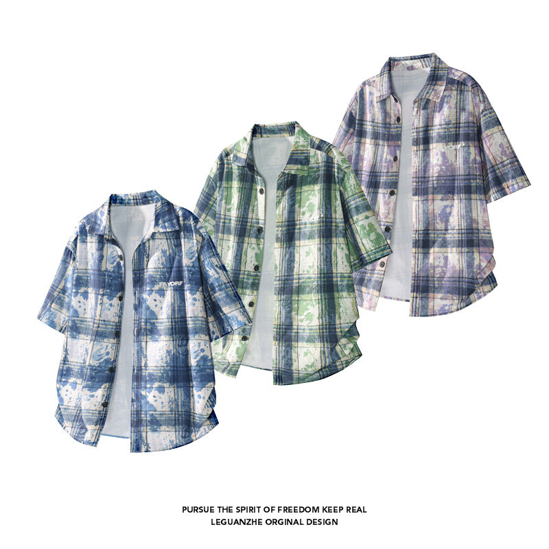 2025 新しい夏の半袖シャツ香港スタイル白底大きいサイズチェック柄シャツアイスシルク半袖シャツティーンエイジャー