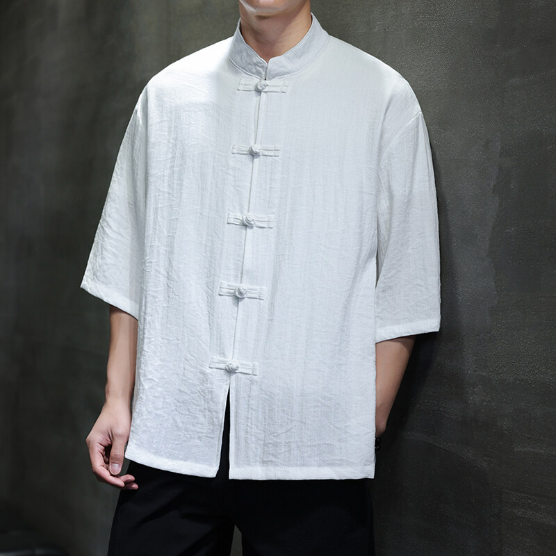 夏半袖シャツ中国風ボタン七分袖シャツメンズ大きいサイズトップスルーズスタンドカラーシャツ