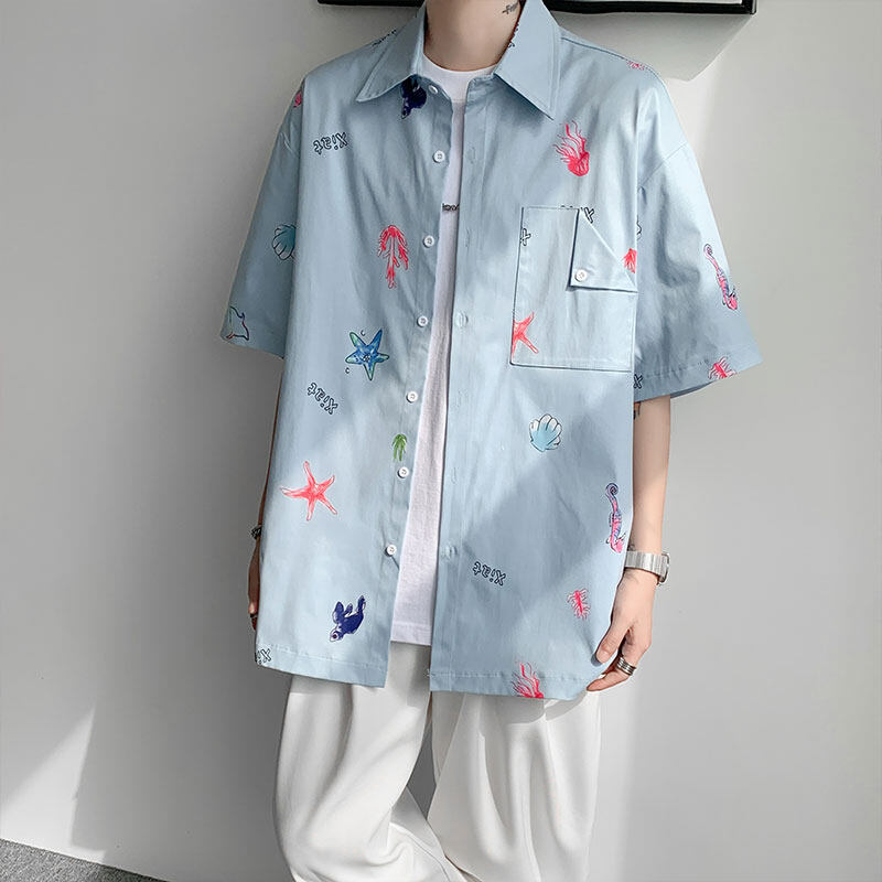 2025 夏の新メンズ半袖シャツプリントシャツメンズカジュアル薄氷シルク半袖シャツルーズ大きいサイズ