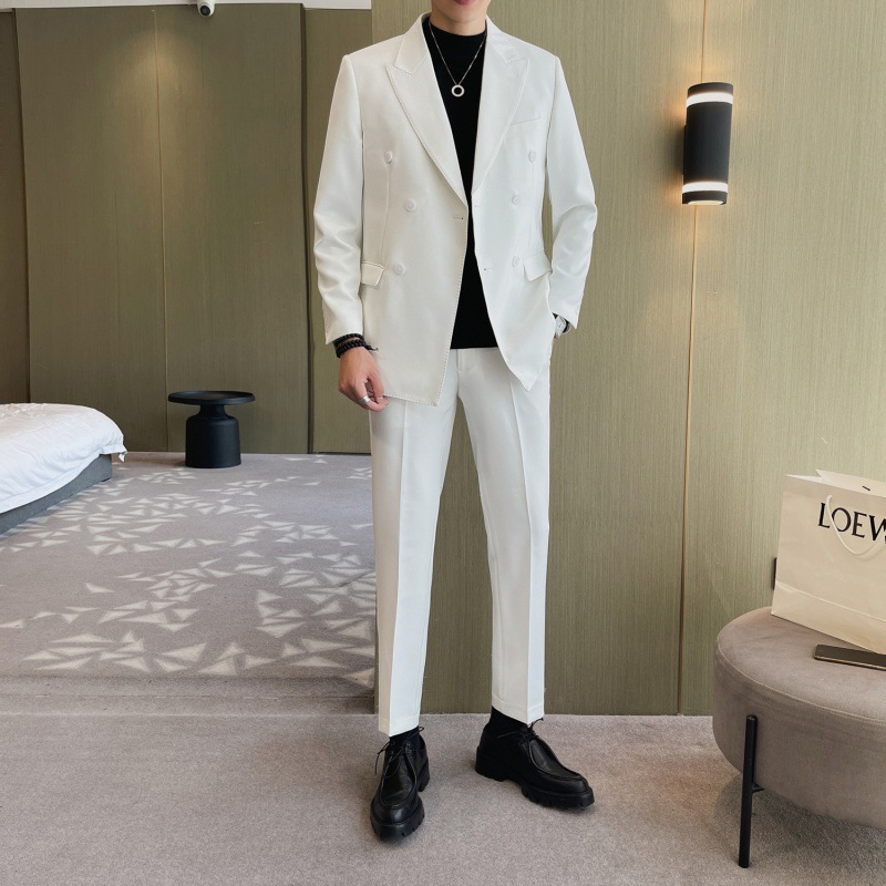 軽熟風男性ダブルボタン白色弾力生地スーツ新郎スーツセットljt 914/p240