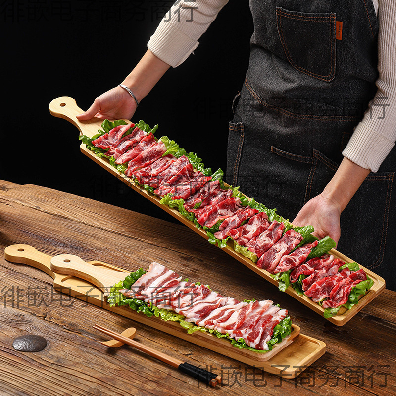 一メートルの脂身の羊肉の長い木の皿のトレーの鍋の皿の料理の皿のアイデアは皿の特色の焼肉の板の食器を並べます。