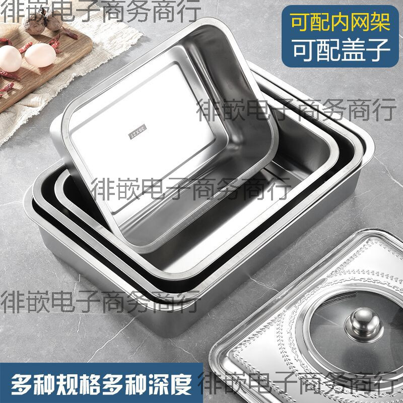 ステンレスたらいの長方形のトレーの蓋の業務用特大サイズの鉄のたらいの四角形の鉄の皿の箱の蓋が付いています。