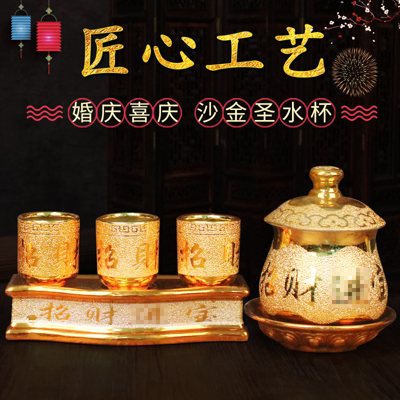陶磁器蓮金沙聖水杯観音杯招財入宝財神杯金色沙金仙家杯供仏堂