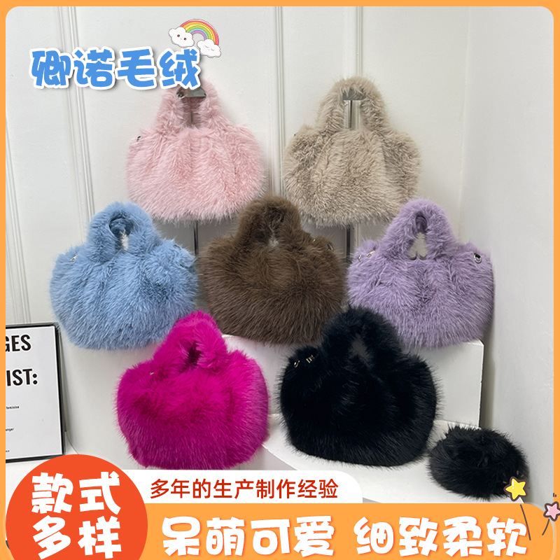 ベルベットのバッグの女性2024秋冬の新しいバラの赤いハンドバッグの人形のモンスターの毛のふわふわしたバケツのバッグ