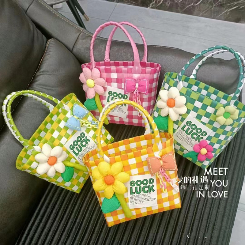 2023新品カラー手編みチェック柄バッグレディースハンドバッグ手提げバスケット買い物袋日常用バッグ
