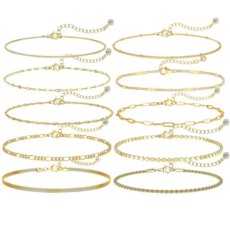 クロスボーダー 10 個のレディースゴールドブレスレット、14K 繊細なレイヤードブレスレット、かわいい積み重ね可能なゴールドチェーンブレスレットセット