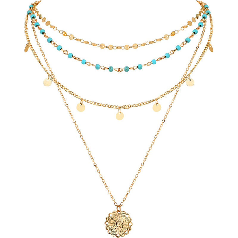 ヨーロッパとアメリカのクロスボーダーネックレスターコイズビーズ鎖骨ネックレス女性のレトロエスニックスタイルディスクペンダントネックレスフラワープレート