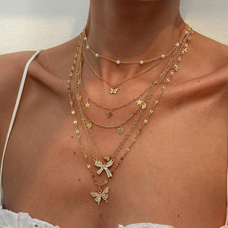 クロスボーダーヨーロッパとアメリカのレトロな気質の女性用蝶ネックレス、甘いロング多層ダイヤモンド蝶ペンダント三層ネックレス