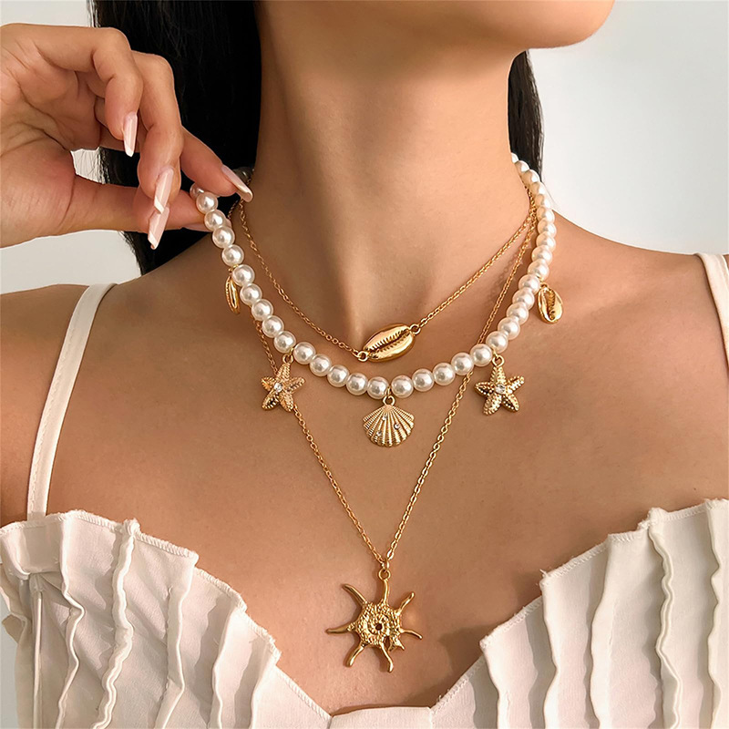 クロスボーダーレディースビーチリゾートスタイルシェルイミテーションパールネックレス多層ビーチヒトデビーズネックレス