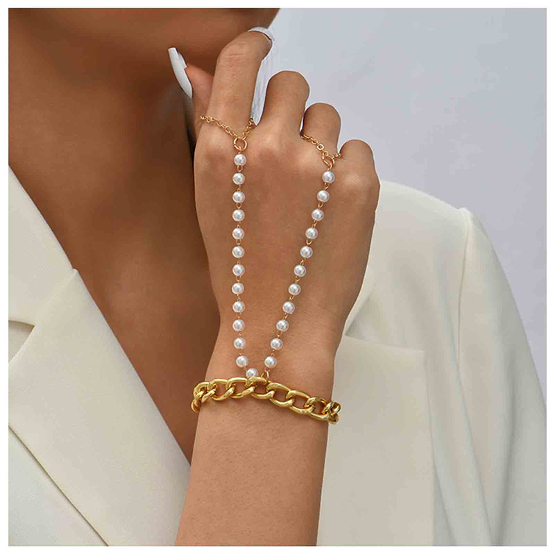 クロスボーダー レディース パール サテライト チェーン ブレスレット ゴールド パール フィンガー チェーン パール ビーズ ステーション ブレスレット