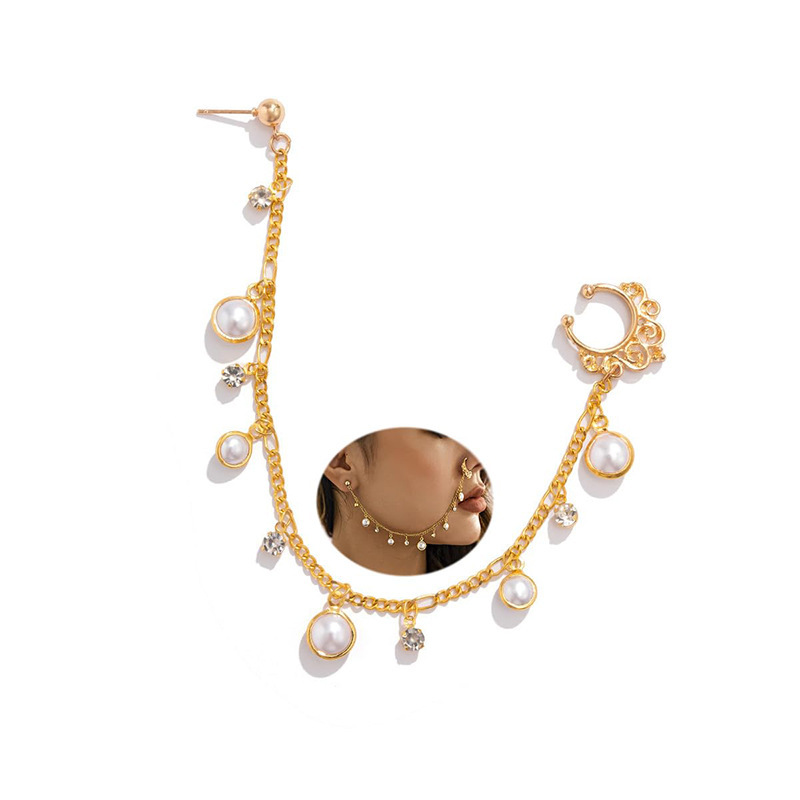 クロスボーダーボヘミアンスタイルインド絶妙なシンプルなシルバーゴールドチェーンセクシーなパールラインストーン鼻リングイヤリングフープチェーン