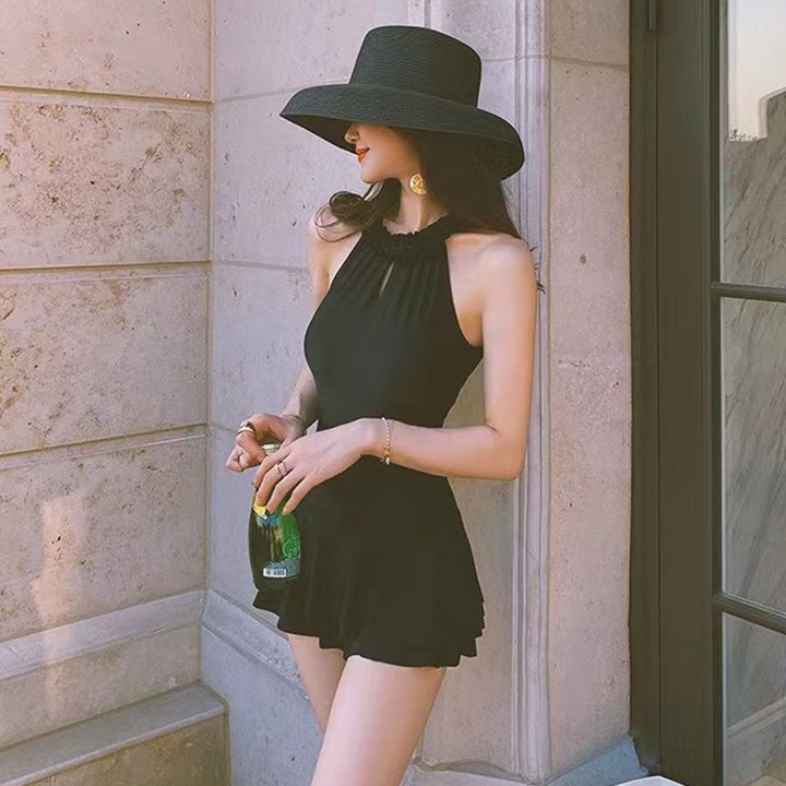 純粋な欲望風黒色ワンピース水着女性用フリル付きプッシュアップ効果で小胸を隠し、お腹をカバーする温泉旅行用水着卸売