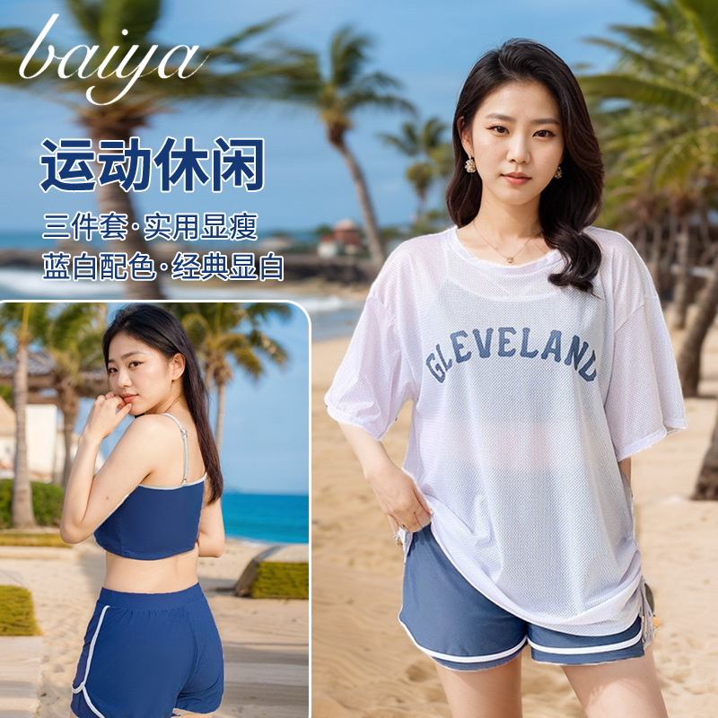 プラスサイズ水着ルーズスポーツスプリットスリーピースセットファットMM 80kg痩身カバー日焼け止めブラウスホリデー水着