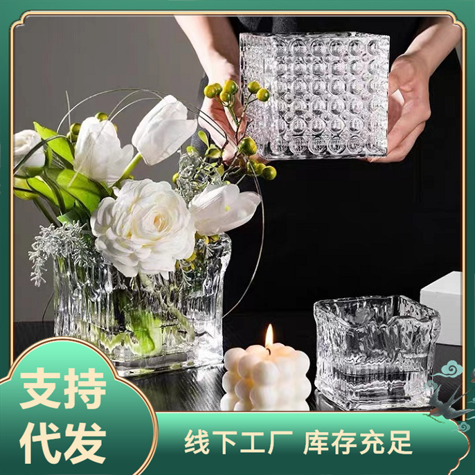 氷河紋角筒創意正方形燭台水培緑植物銅銭草白掌緑羅水養ガラス花瓶