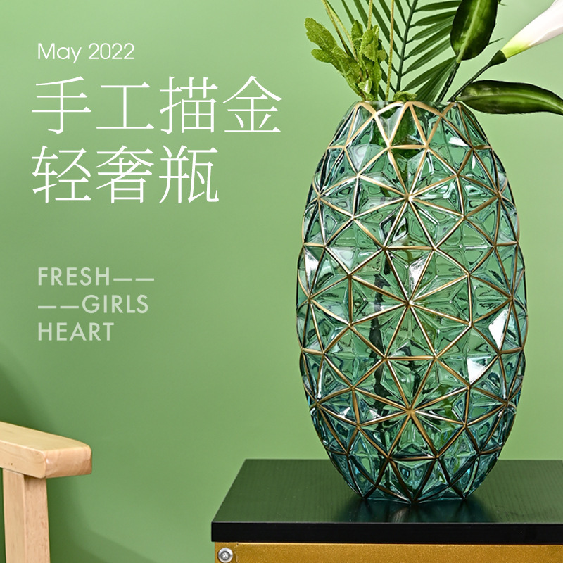 創意軽豪華北欧風描金ガラス花瓶リビング玄関家庭装飾品色絵生け花透明置物