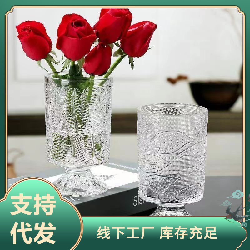 軽くて豪華でシンプルなガラス花瓶ins風レリーフ高足カップ装飾ガラス生け花客間装飾置物