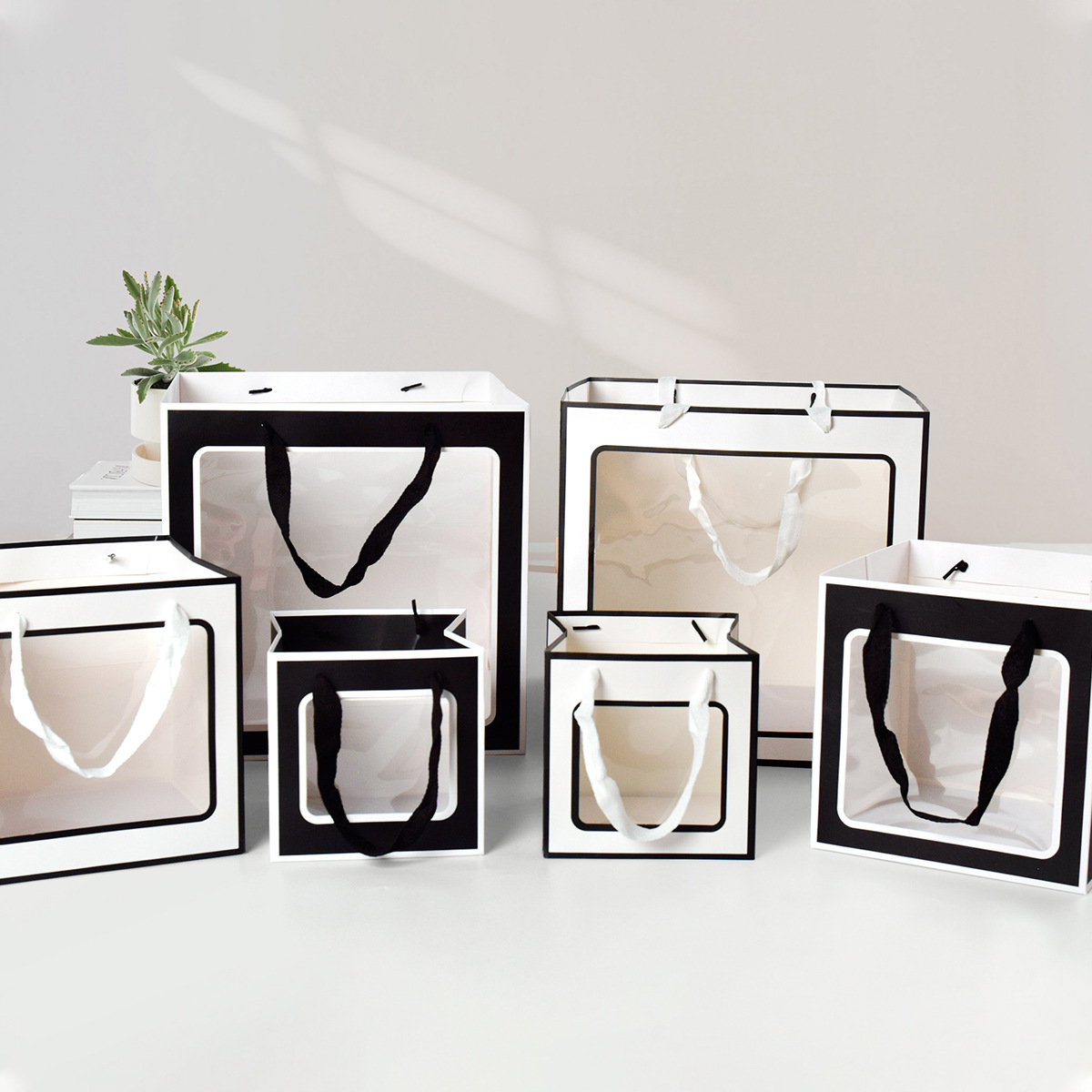 シンプルな風の白黒の正方形の祝日の透明なショーウインドーのお土産の手提げ袋の贈り物の紙袋の花のケーキの贈り物の袋