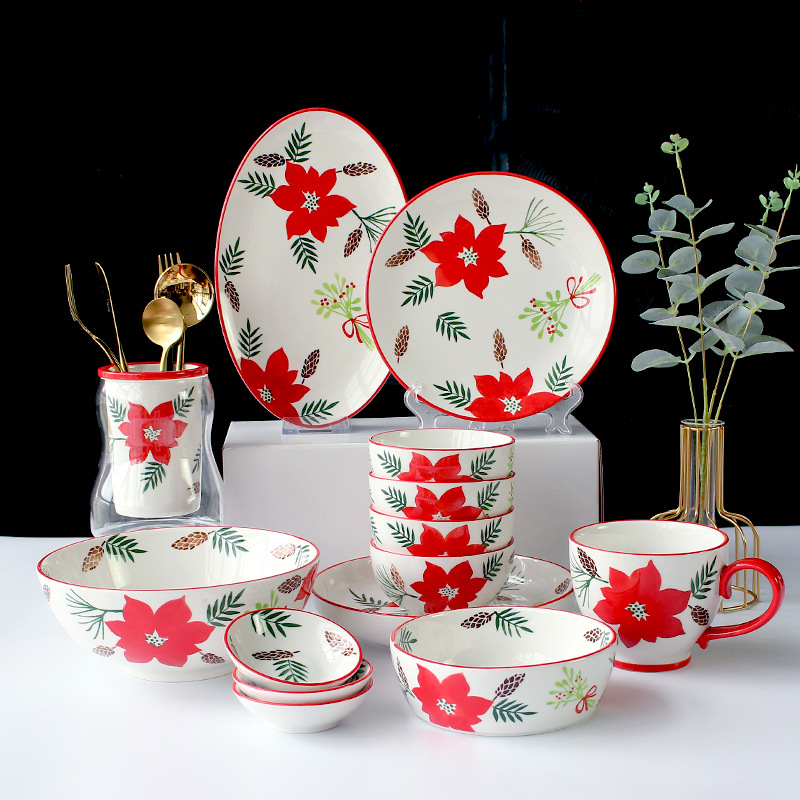 オリジナル家庭用食器セット大紅花釉薬下彩茶碗スープ碗プレゼント中国式陶磁器碗皿皿