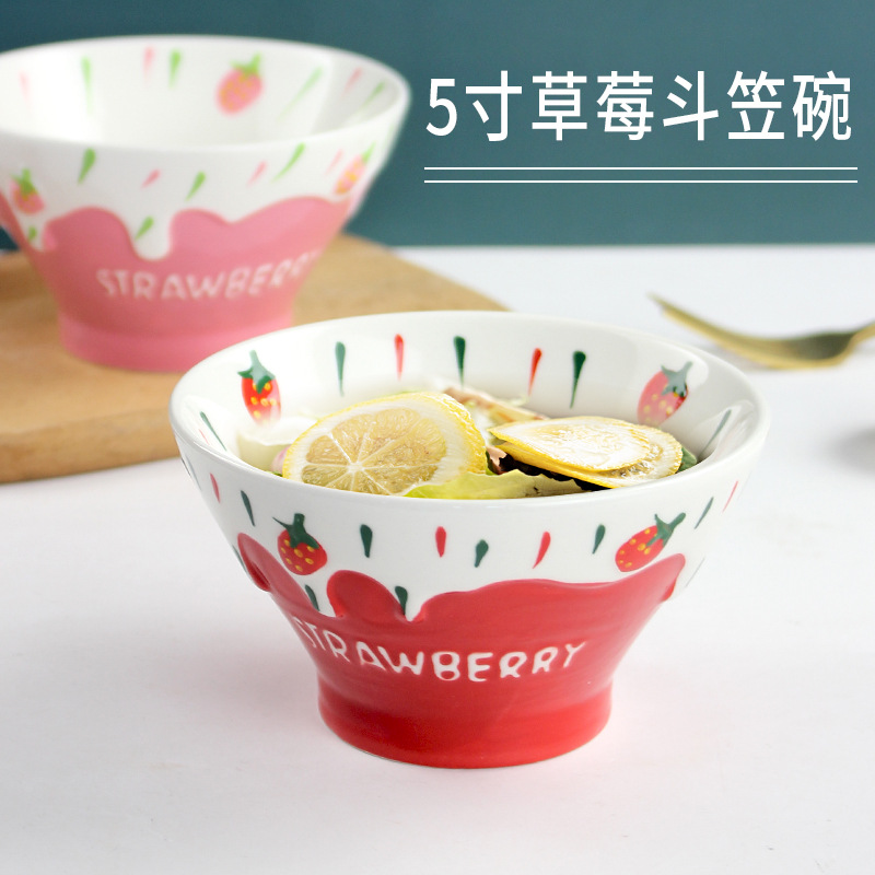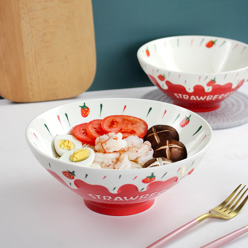 卸売のかわいいイチゴ柄ラーメン鉢、陶器製、釉下彩、耐熱性、大型スープ鉢、和風斗笠型ご飯鉢、インスタントラーメン用