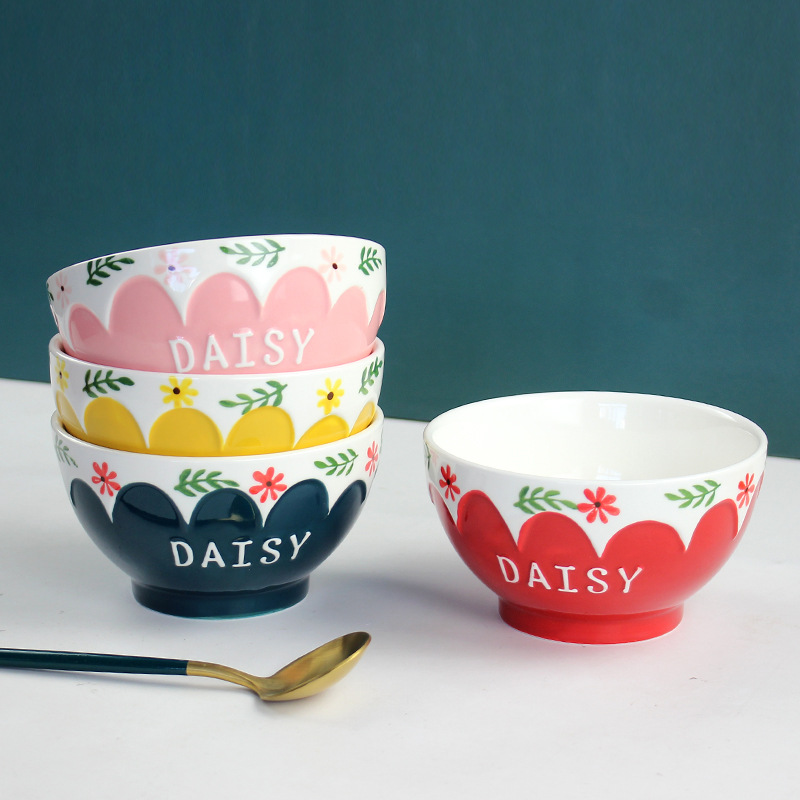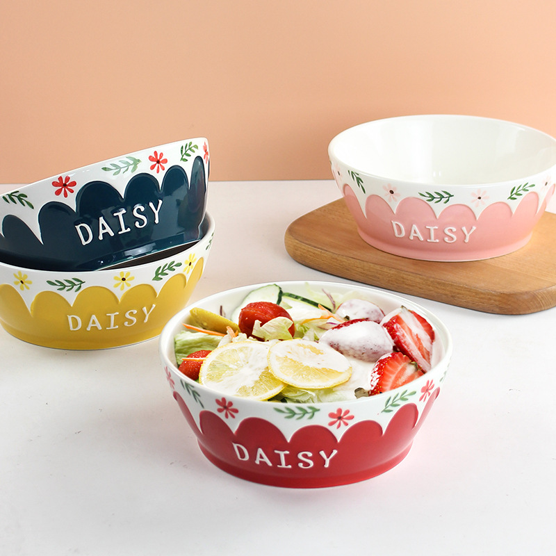 かわいい食器レリーフ手描きデイジー6インチサラダボウル家庭用クリエイティブセラミック食器デザート朝食ボウル