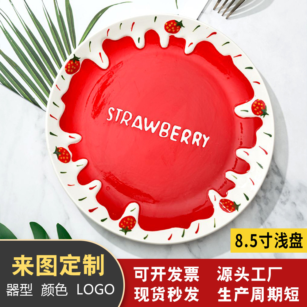 8.5インチ釉薬下彩セラミック皿少女心イチゴ赤浅皿家庭用食器ins浮き彫り皿