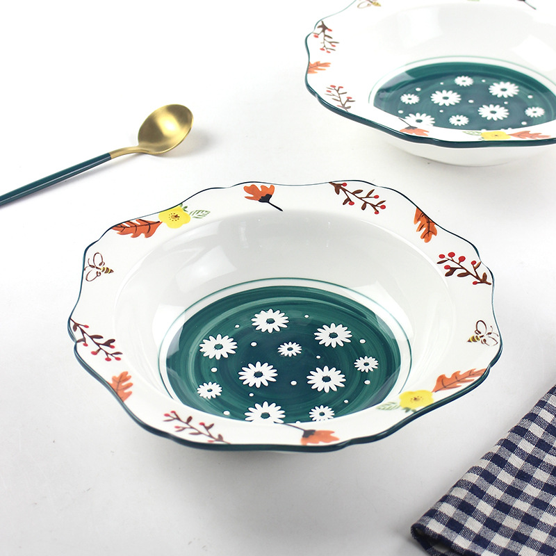 田園小清新花叢デイジー陶磁器深皿日本式ins食器釉薬下彩9インチフルーツサラダ皿