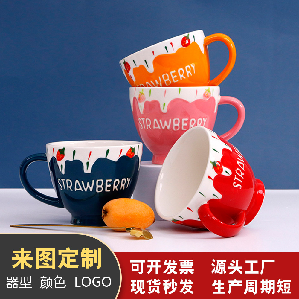 網紅創意浮き彫り可愛いイチゴマグカップins陶磁器釉薬下彩朝食オート麦ヨーグルト陶磁器カップ