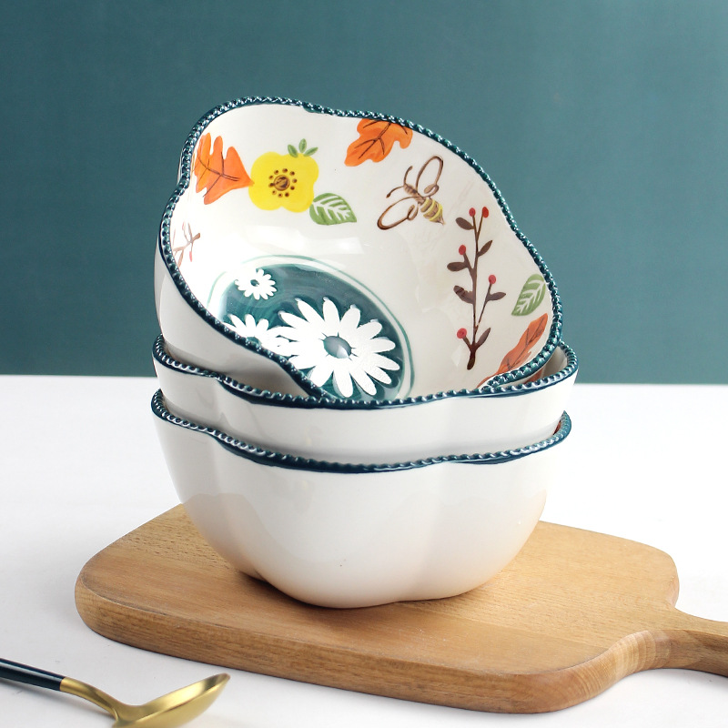 卸売り花型陶磁器アイスクリームボウル手描き田園風ヨーグルトサラダデザートボウルオリジナルデザイン家庭用食器