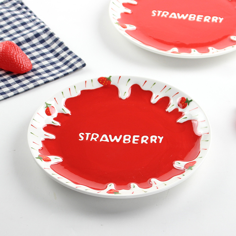 8.5inch セラミックプレート 家庭用イチゴエンボス朝食プレート 赤い釉下彩 デザート洋食プレート かわいい