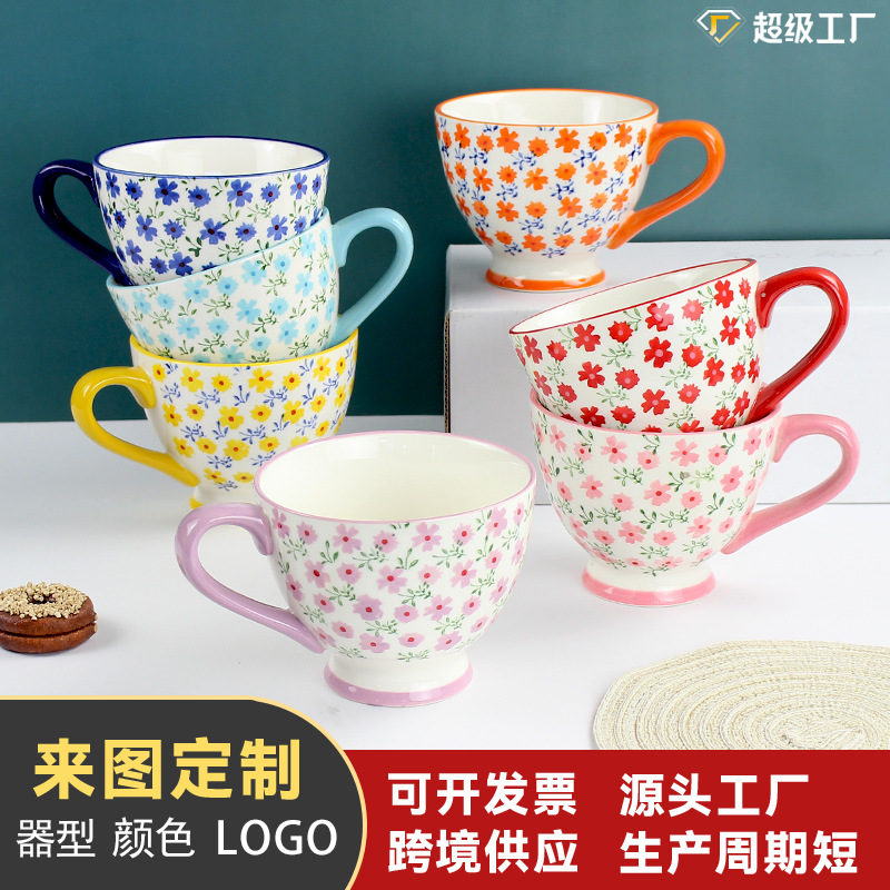 カスタマイズされた手描きの花柄背の高いカップ、下絵色のクリエイティブなセラミック朝食カップ、ウォーターカップ、軽い高級感とハイエンドのコーヒーカップ