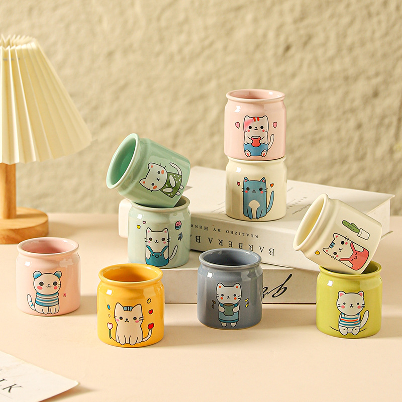 卸売かわいい子供用セラミックドリンクカップかわいい猫柄ヨーグルトプリンカップ電子レンジ対応