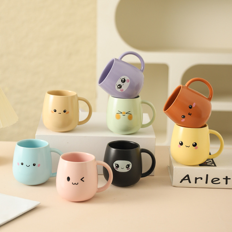 かわいい陶器製コーヒーカップ、個性的なクリエイティブな新商品、漫画の表情が描かれたマグカップ、モランディカラーのオフィス用ウォーターカップ