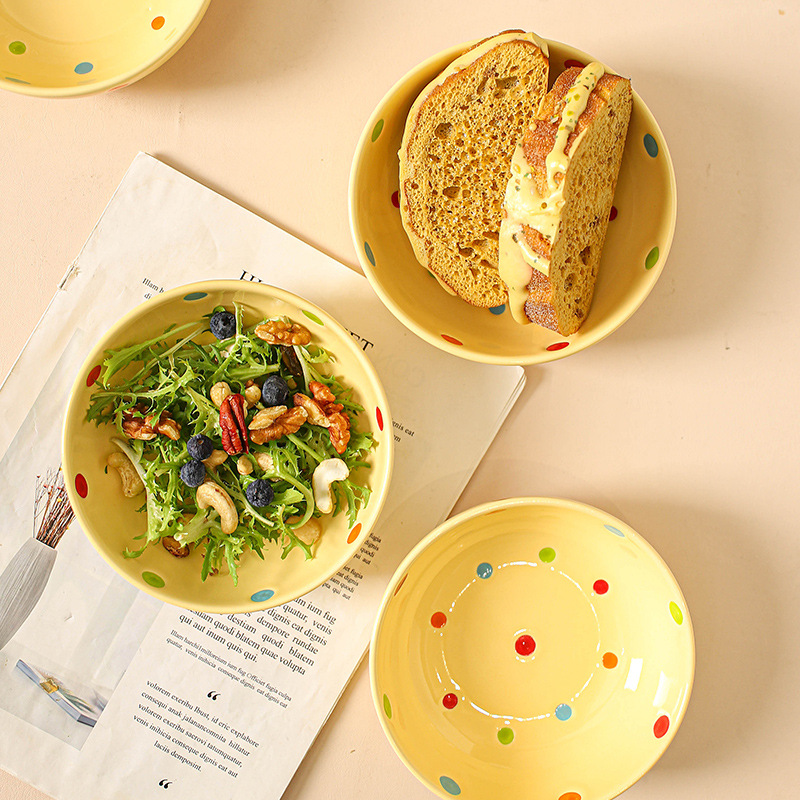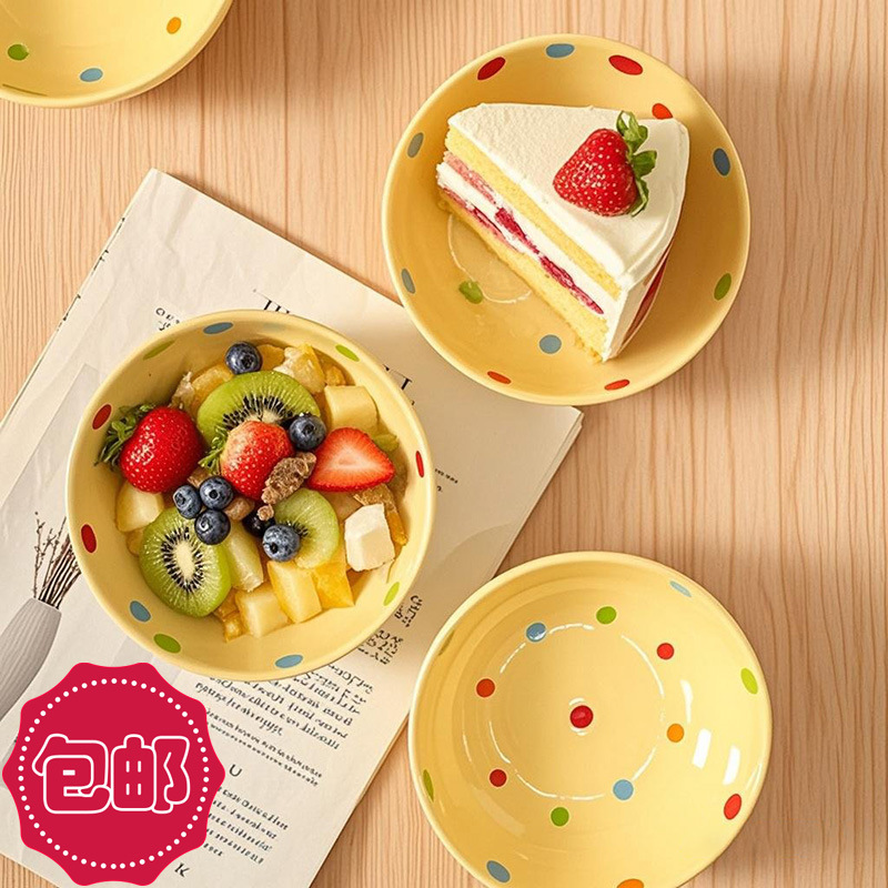 包邮高颜值彩绘波点酸奶沙拉碗家用陶瓷碗釉下彩奶油风汤面碗餐具