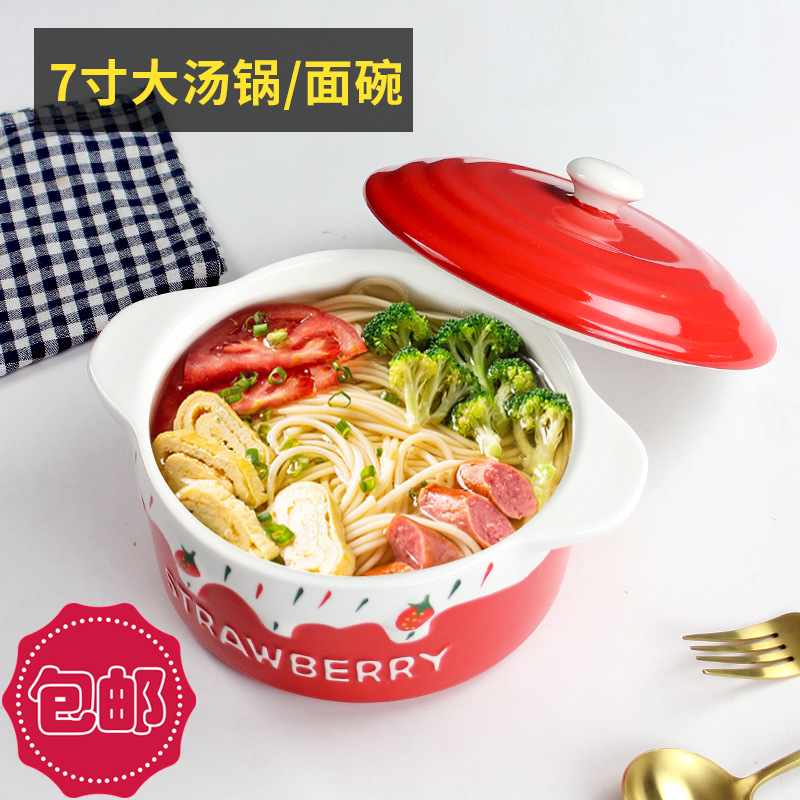 包郵便陶磁器両耳スープ碗家庭用耐高温大サイズ麺碗高顔値浮き彫りイチゴ蓋付きスープ鍋食器