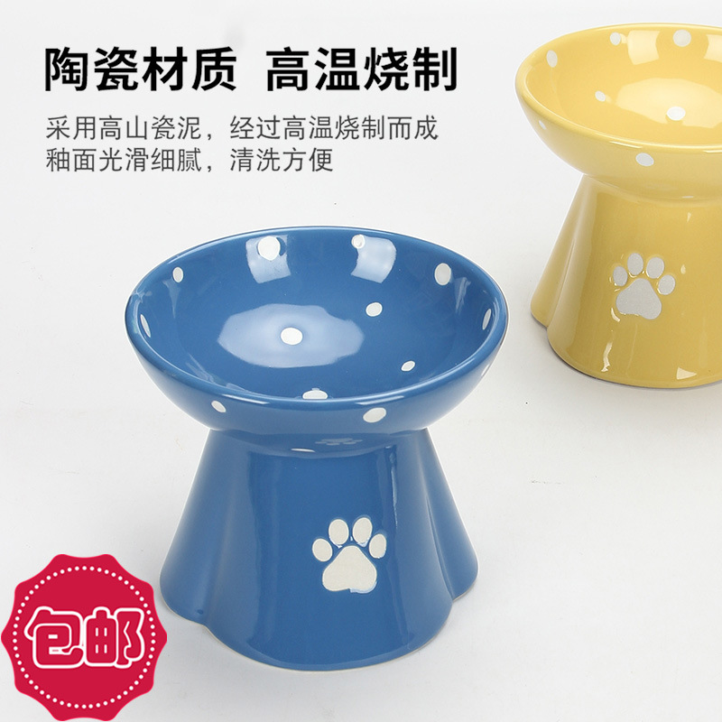 送料無料ハイエンドセラミックボウルペット食器猫フードボウルかわいい水玉犬首保護背の高いボウル