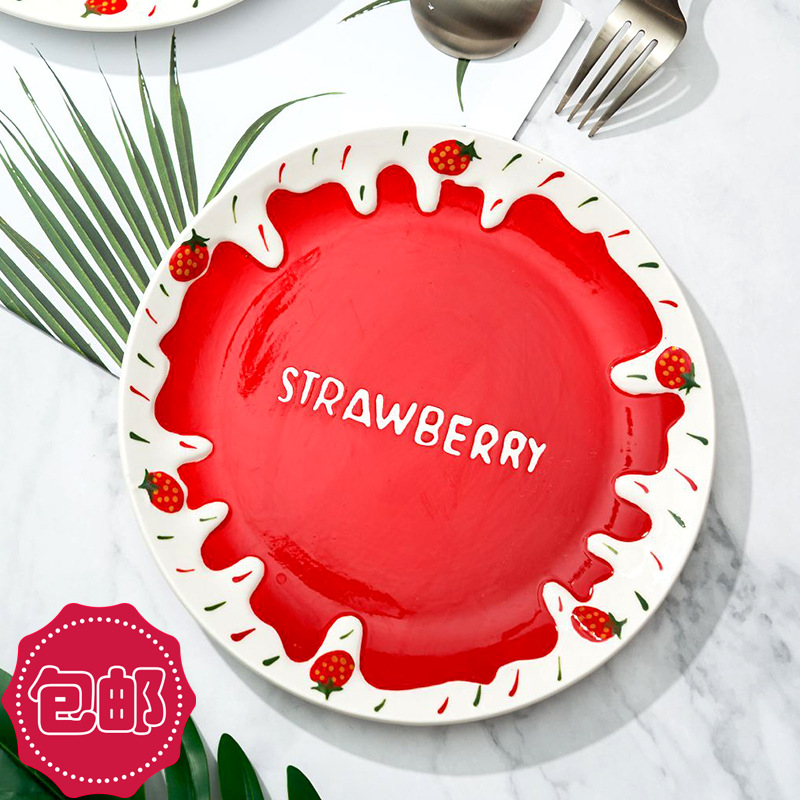 卸売り包郵便陶磁器皿創意浮き彫りいちご8.5インチ浅皿ins風家庭用食器皿洋食皿