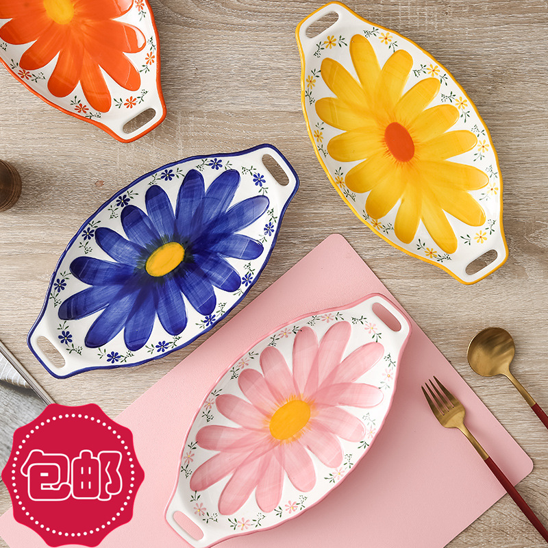 卸売りは陶磁器の食事の皿の手描きの花の双耳の皿の高級感の家庭用果物のステーキの蒸し魚の皿を郵送します。