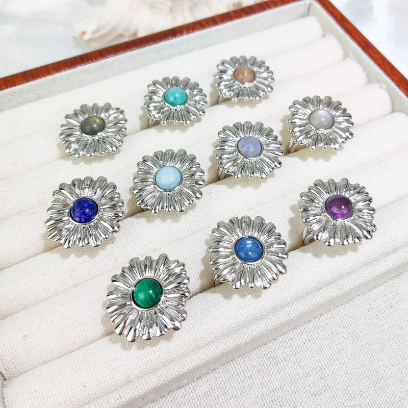 天然石アマゾナイトひまわりリングレディース爪入れクリスタルラピスラズリラウンド宝石リング菊の指輪