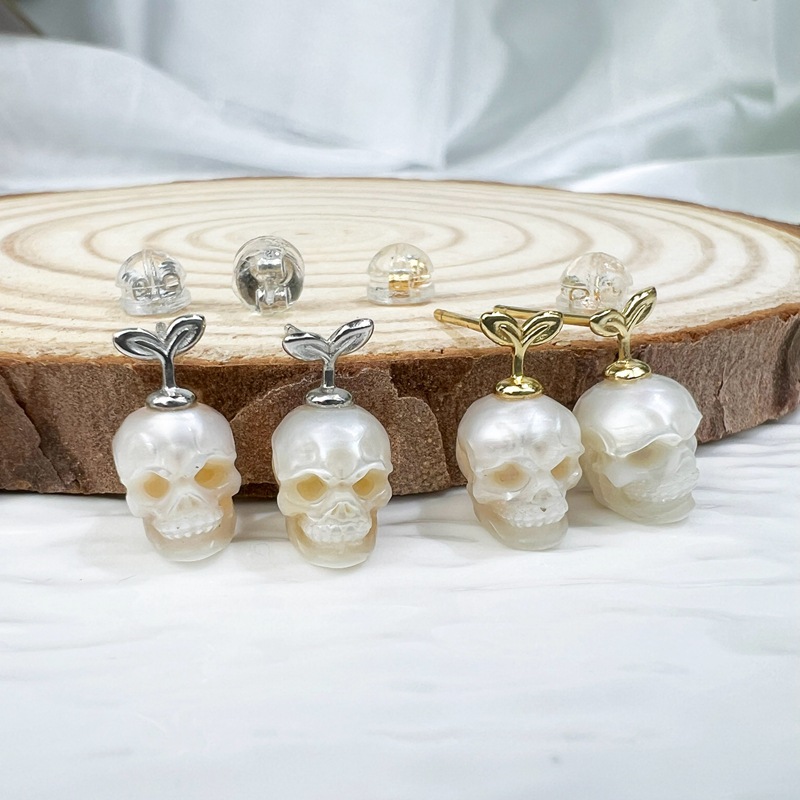 天然真珠彫刻鬼頭s999純銀桃心耳ピアス