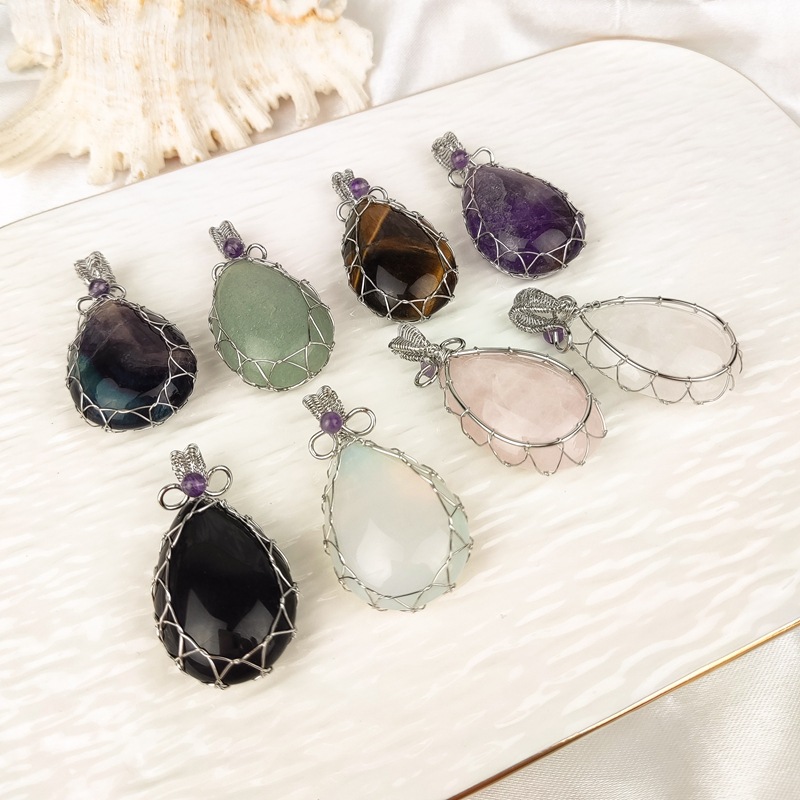 クロスボーダー天然石粉水晶巻き線水滴形紫晶ペンダントdiy鎖骨チェーン誇張緑東陵セーターチェーン