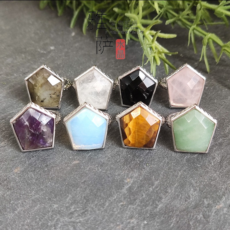 天然水晶宝石五角形の切断面の指輪のリングの口は虎の目の石の復古の指輪のアマゾンを調節することができます。